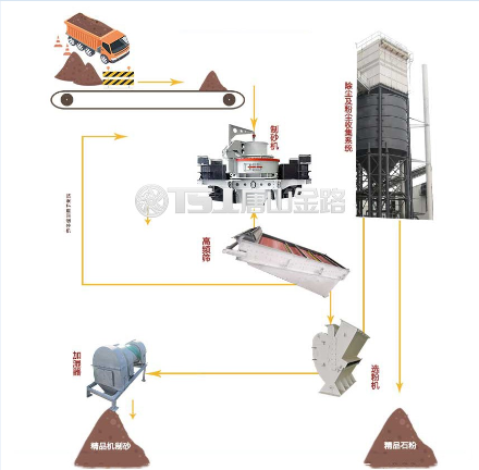 物料首先從原料倉(cāng)經(jīng)過電子秤進(jìn)入到皮帶輸送機(jī)中,再由提升機(jī)將物料入到制砂機(jī)內(nèi)進(jìn)行破碎處理,破碎后的物料進(jìn)入高頻篩中進(jìn)行篩分,篩分后的較大物料會(huì)返回制砂機(jī)內(nèi)進(jìn)行二次破碎,符合要求的砂子則會(huì)進(jìn)入選粉機(jī)中進(jìn)行選粉處理,產(chǎn)生的粉塵會(huì)經(jīng)由粗細(xì)粉分離機(jī)進(jìn)入到布袋收塵器。最后,篩分選粉合格的產(chǎn)品會(huì)進(jìn)入加濕拌合機(jī)進(jìn)行加水處理,防止機(jī)制砂在運(yùn)輸過程中產(chǎn)生離析或揚(yáng)塵。